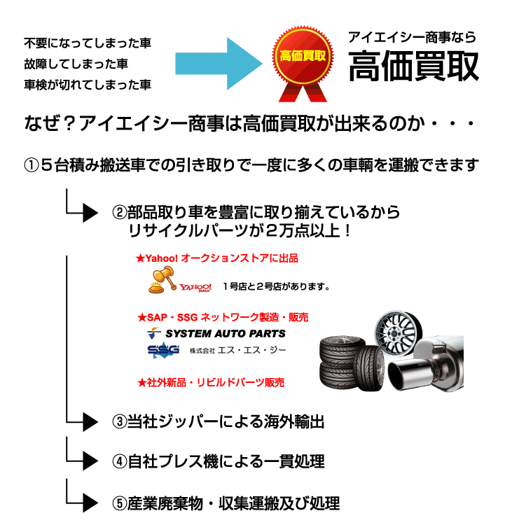 北海道・道北 旭川市での事故車・廃車・不要な車の引き取り、リサイクルパーツ(中古部品)はアイエイシー商事にお任せ下さい